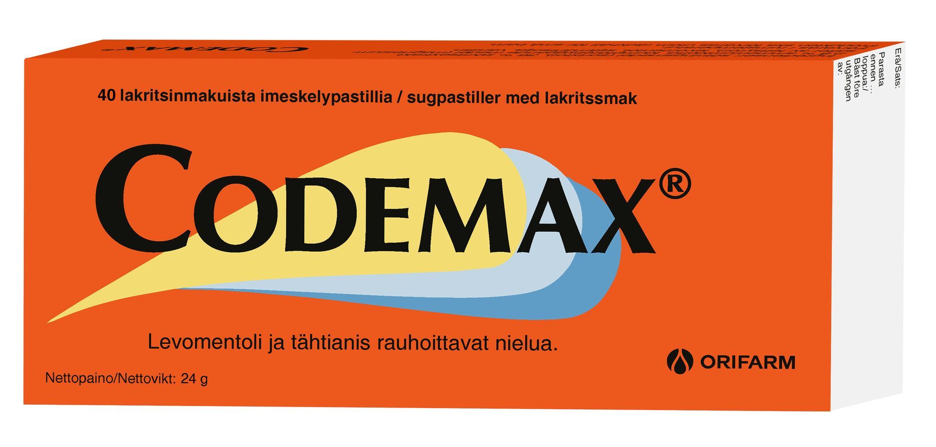 Imeskeltävä vahvan lakritsinmakuinen pastilli nielun rauhoittamiseen.